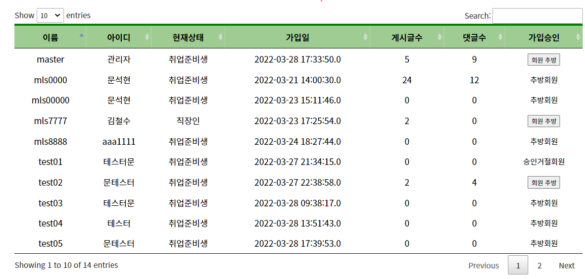 요기 위에 보이는 승인 거절회원 , 추방회원 가입 승인 이렇게 구분되어있다.